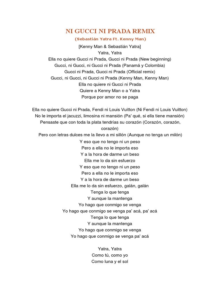 Ella No Quiere Gucci Ni Prada / Kenny man] ella no quiere fendi, ni gucci ni prada a ella no le importa si la busco en un lada contigo está vacía, conmigo se siente amada aunque tú lo tengas to' y yo no pueda darle nada los fines de semana ella me invita a tu jacuzzi la ropa que le compra' es a mí a quien se la.